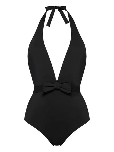 black halter neck plunging neckline bow detail low back high-leg cut Be mindful to try on swimwear over your own garments.