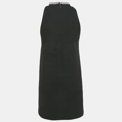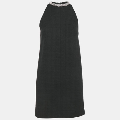 Black tweed cut into a straight mini, this Sandro dress keeps its lines minimal and lets the collar do the work. The neckline is lit with crystals, giving just enough sparkle to take it from dinner reservations to late night events without needing anything more.