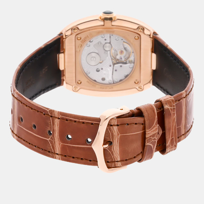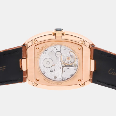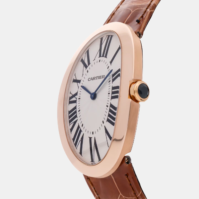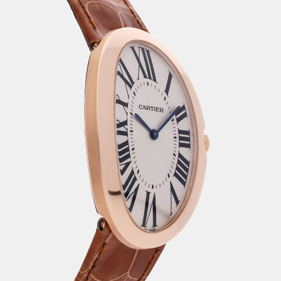 Cartier showcases refined artistry in this Pre Owned Baignoire, featuring a polished 18k rose gold case and a sleek silver dial. Its manual winding movement and elegant 34 mm design embody timeless sophistication and the enduring charm of Cartier craftsmanship.
