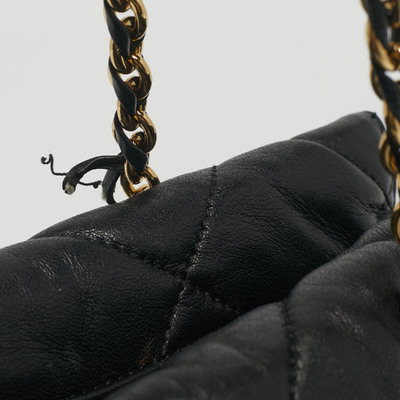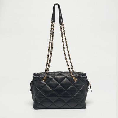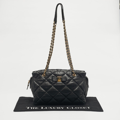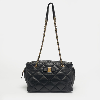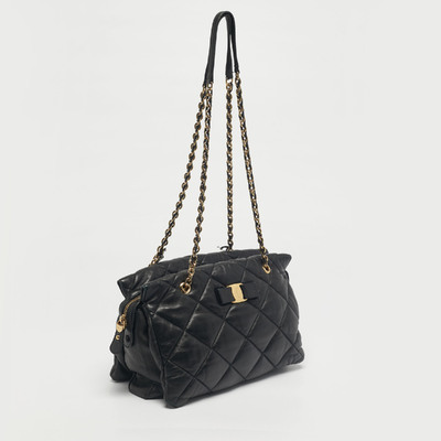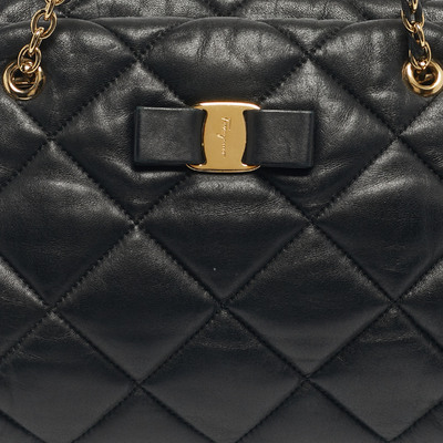 Crafted from quilted black leather, the Ginette shoulder bag brings together structure and softness in true Ferragamo style. The gold tone chain strap adds a polished accent, while the spacious interior makes it a versatile companion from day to evening.