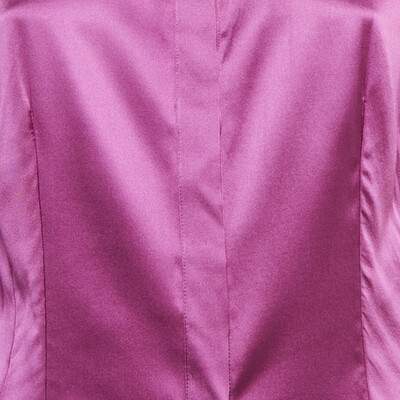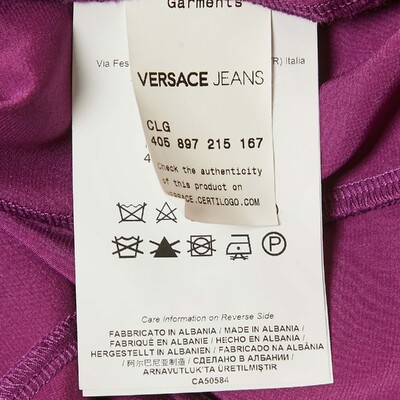 In lustrous magenta silk, this Versace shirt carries long sleeves and a classic collar, its smooth finish catching the light with ease. Buttoned cuffs and front keep the line clean, letting the vivid color speak for itself in any setting.