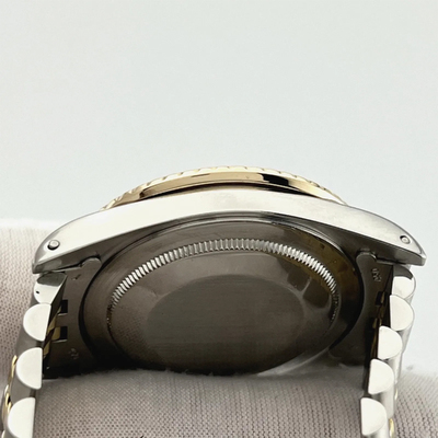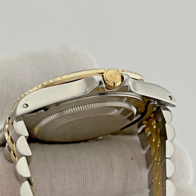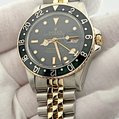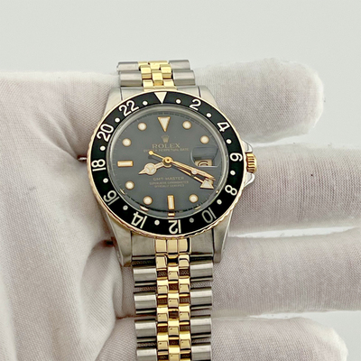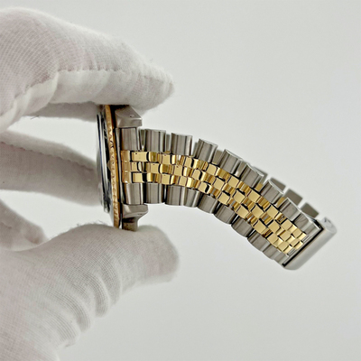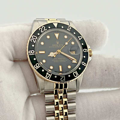 This 40 mm Rolex GMT Master 16753 blends stainless steel strength with 18K yellow gold elegance, creating a luxurious dual time tool watch. Its black dial and automatic movement offer reliability for travelers who appreciate both functionality and refined style.
