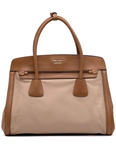 canvas body with a saffiano leather trim rolled leather handles front and back exterior slip pockets open top with a magnetic snap button closure interior zip and slip pockets brown Inclusions: authenticity card. Condition: GOOD. This previously owned and used item is in good condition with minimal signs of use. This may include fading of material or plating and scratches. Declared Damages: Exterior Bottom Feature(s) Minor Peeling. Please refer to the photos on this product page for a detailed view of the item, including any damages declared.