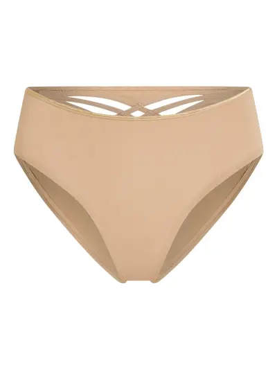 light brown 8cm rise criss-cross straps gold-tone trim Just a reminder that this piece must be tried on over your own garments.