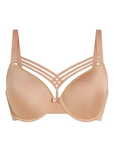glossy camel padded cups multi-strap detail bow detail hook-and-eye closure adjustable straps