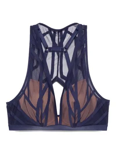 midnight blue rear hook fastening push-up design strap detailing semi-sheer construction