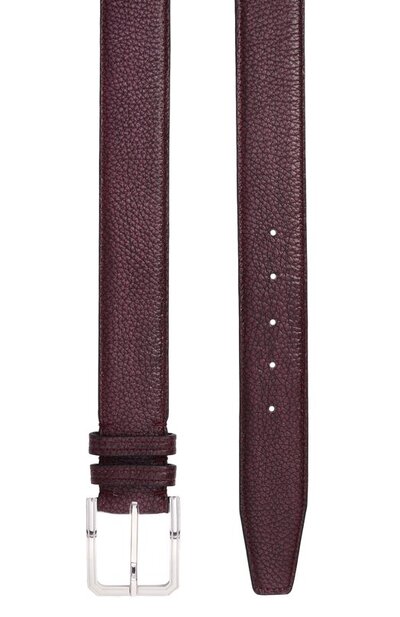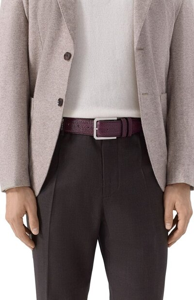 Для создания ремня средней ширины выбрали крупнозернистую кожу. Аксессуар с двумя неподвижными шлевками застегивается узкой геометричной пряжкой.