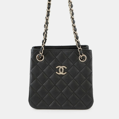 The CHANEL Matelassé Mini Bucket Bag in black caviar leather features a classic quilted texture and a chain shoulder strap. Its compact form makes it a go to for light carry.