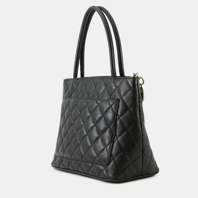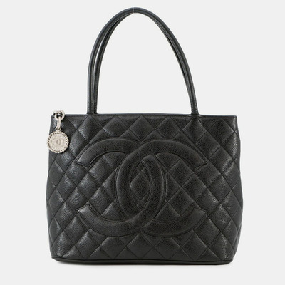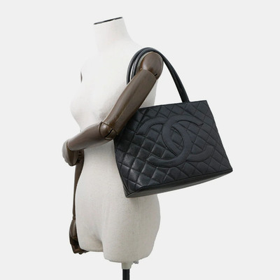 Crafted in durable black caviar leather, the CHANEL Medallion Tote features the iconic CC logo and a spacious interior, ideal for daily carry. Its zip closure and structured handles offer comfort and functionality.