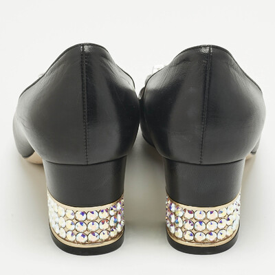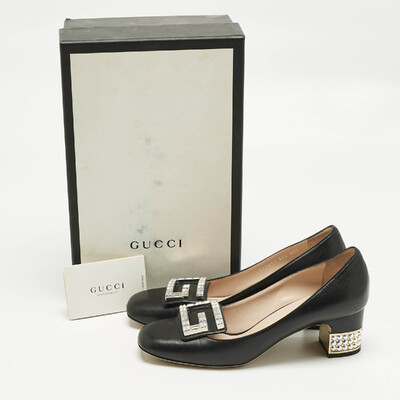 Gucci’s Madeleine pumps frame black leather with a flash of crystal at the front, where the signature motif gleams like jewelry. The block heels and classic form are softened by the light catching detail, turning a pump into something closer to an ornament.