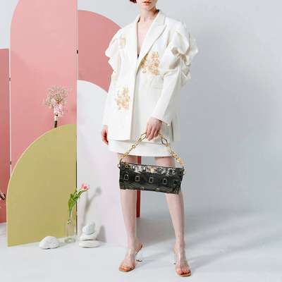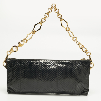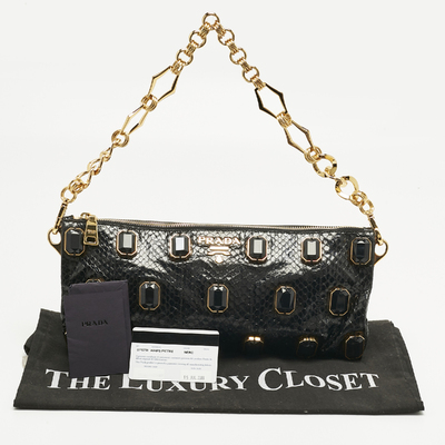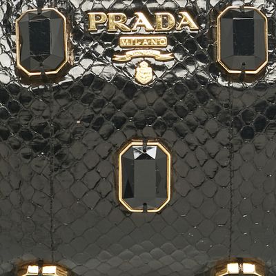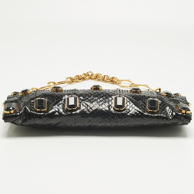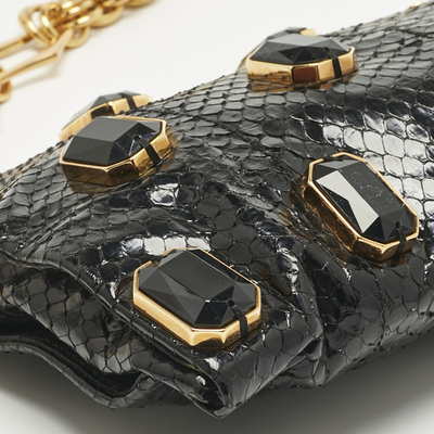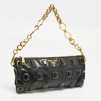 This designer bag looks less like a bag and more like a piece lifted from a jewelry vault. Prada sets glossy black snakeskin with oversized stones, each framed in gold tone metal, like gems locked into place. The chain strap feels sculptural, almost armor like, catching the light with every move. Carried in hand or on the shoulder, it belongs to nights where accessories are not accents but the center of the story.