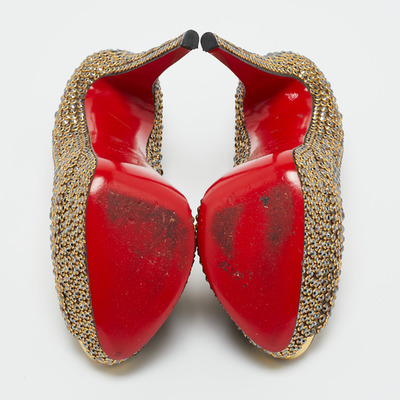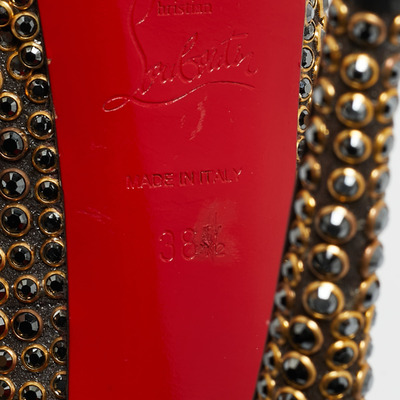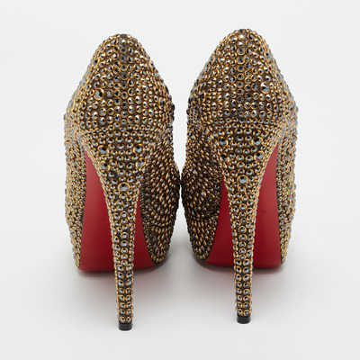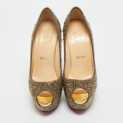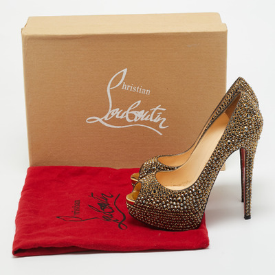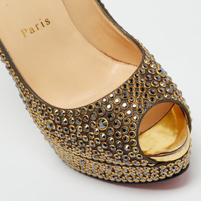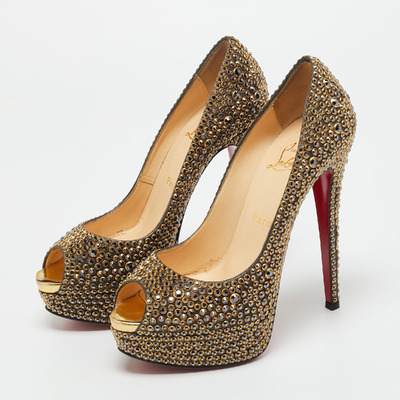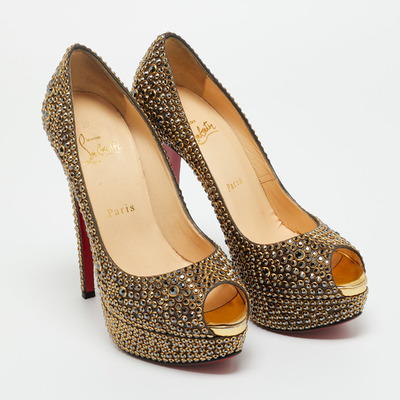 Stand out from the crowd with this luxurious pair of Louboutins that exude high fashion with class. Crafted from leather and decorated with crystals, this is a creation from their Lady Peep collection. It features peep toes and an architectural shape. Completed with leather insoles, stiletto heels, and signature red lacquered soles, these shoes are elegant.
