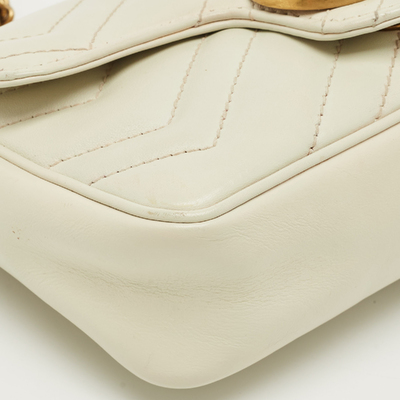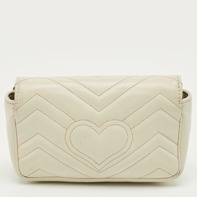 Gucci’s Super Mini GG Marmont in off white matelassé leather distils its beloved line into a petite evening option. Chevron quilting and the GG logo add texture and shine. Carry it with slip dresses or denim alike for a polished accent.