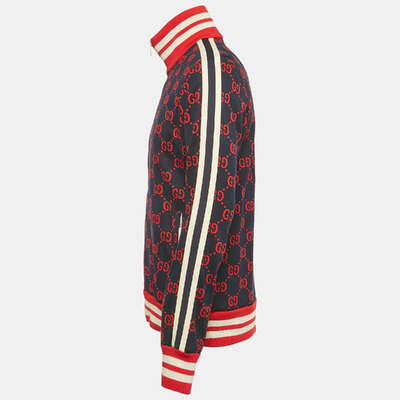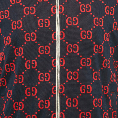 Gucci’s zip up jacket in navy blue GG jacquard cotton knit blends sportswear ease with heritage branding. The iconic pattern covers a sleek silhouette designed for layering. Perfect over jeans for a luxury streetwear look or teamed with matching joggers for a coordinated set.