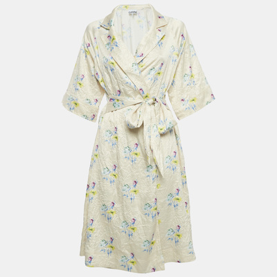Ganni Cream Floral Print Satin Crinkled Wrap Dress M 1221202 (lpn31009853)