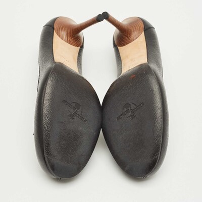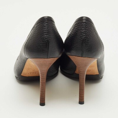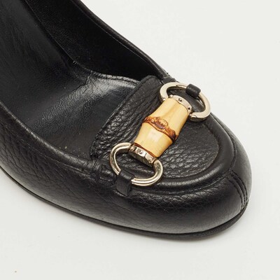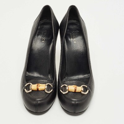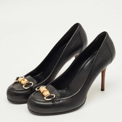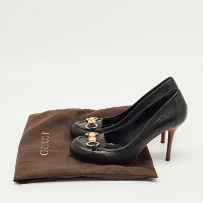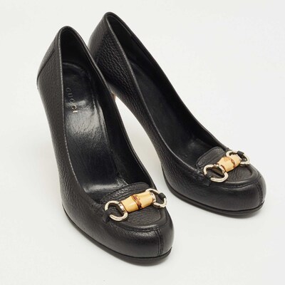 Gucci’s loafer pumps in black leather feature bamboo horsebit detailing—a blend of two iconic house signatures. The structured heel and classic profile ensure timeless appeal. Wear with tailored suits or midi skirts for a polished day to evening option.