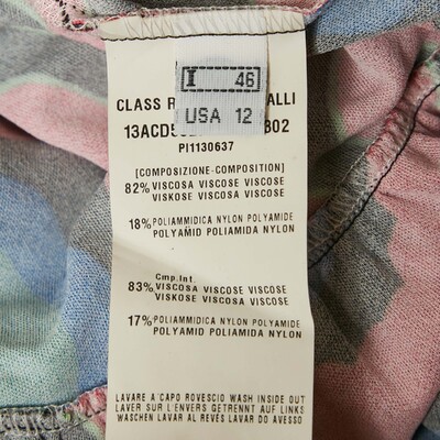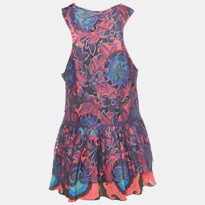 This Class by Roberto Cavalli top layers vibrant printed fabric beneath violet floral lace, creating a striking interplay of color and texture. The sleeveless cut and gently flared hem give it an effortless sense of movement.