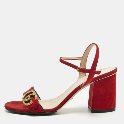 Gucci’s ankle strap sandals are crafted in rich red suede with signature gold tone GG detail. The elegant straps provide a secure fit while enhancing the luxe aesthetic. Perfect for both formal occasions and stylish evening events.