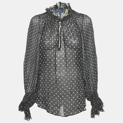 Lightweight georgette shapes this Polo Ralph Lauren blouse, with black polka dots floating across a sheer canvas. A relaxed cut and flowing sleeves lend the blouse an elegant presence.
