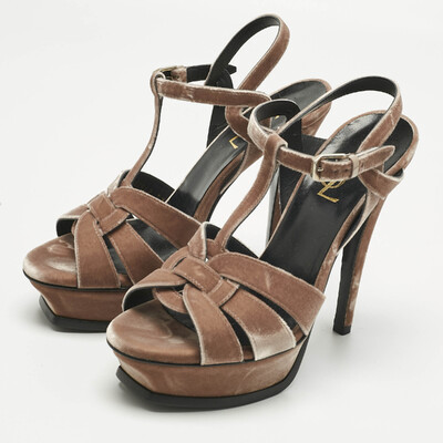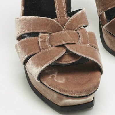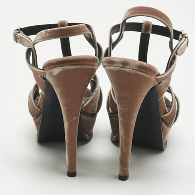 Soft velvet shapes these preloved Saint Laurent sandals in deep beige. A delicate ankle strap secures the design, while a 14 cm heel boosts the silhouette.