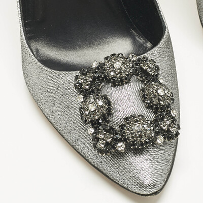 Manolo Blahnik’s Hangisi sparkles in silver lurex, crowned with its jeweled buckle. An icon rendered in light catching fabric.