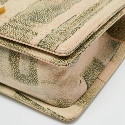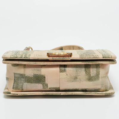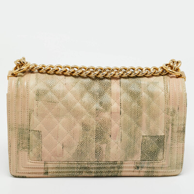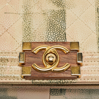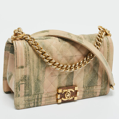 This medium Boy flap bag reimagines one of Chanel’s most iconic silhouettes in green and beige caviar leather with a hand painted effect across its signature quilting. The durable caviar leather gives the piece its structured body and tactile grain, while the artistic finish makes each bag feel subtly unique. It retains all the hallmarks of the Boy line—the bold rectangular frame, chunky chain strap, and distinctive push lock clasp—but with a softer, more avant garde palette. Inside, the thoughtfully designed interior offers space for daily essentials, keeping practicality aligned with statement style. For collectors, it’s a rare chance to own a classic Chanel design with a modern, artistic twist that stands out from the standard black or beige options, making it equally suited for day wear, evening events, or as a centrepiece in a curated handbag wardrobe.