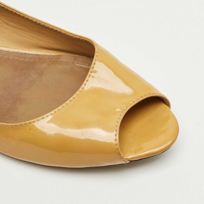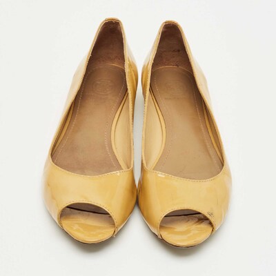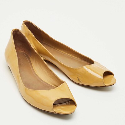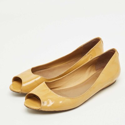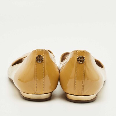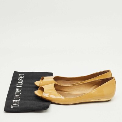 Tory Burch’s peep toe ballet flats in beige patent leather offer a glossy update on a timeless silhouette. Comfortable and feminine, they move easily from day to evening. Perfect with shift dresses or slim jeans for understated polish.