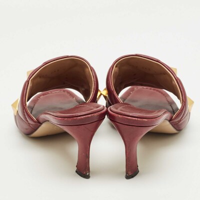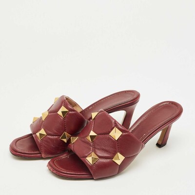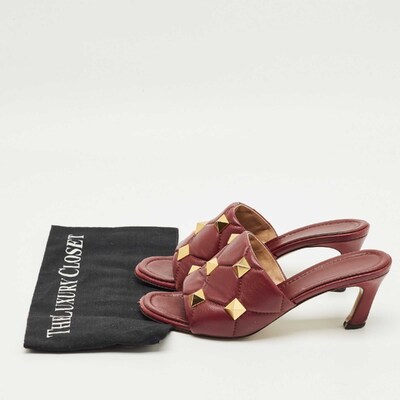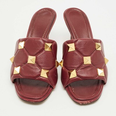 Crafted in dark red leather, these Valentino Garavani slide sandals are punctuated with oversized Roman Studs. The profile is balanced by bold detailing, delivering a design that is both chic and unmistakably iconic.