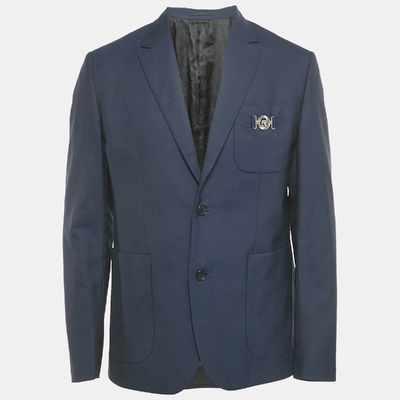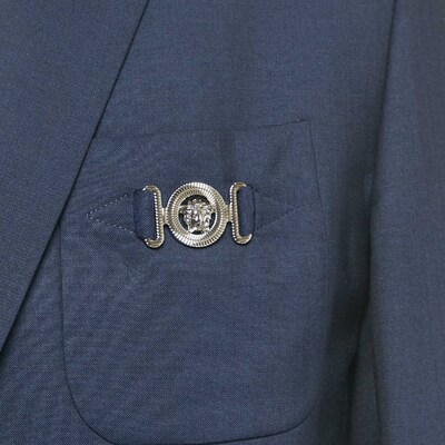 Versace infuses classic tailoring with bold character in this blue wool blazer featuring Medusa pocket details. The vibrant hue and signature hardware make it instantly recognisable. Team with black trousers to let the colour and detailing stand out.