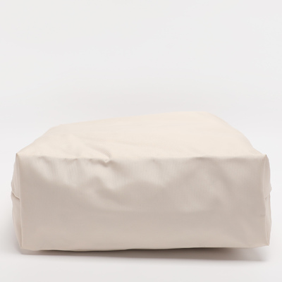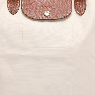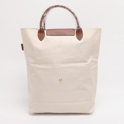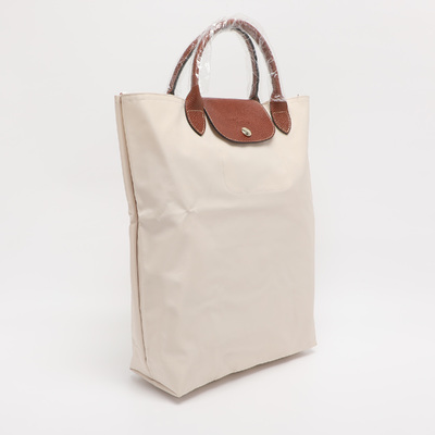 Longchamp’s Le Pliage tote in light beige nylon with brown leather trim is the brand’s travel icon, known for its foldable practicality and polished finish. Its roomy interior and classic palette make it endlessly versatile. Ideal as a weekday carryall or a refined weekender.