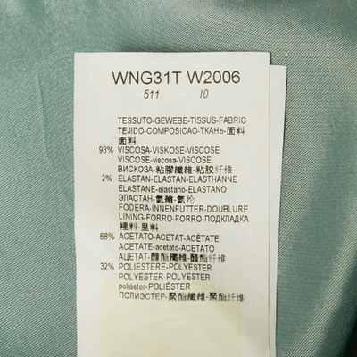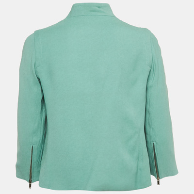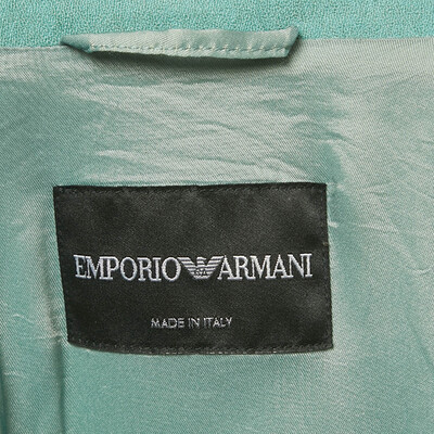 Emporio Armani’s zip up jacket in mint green crepe combines tailored lines with soft texture. A versatile layer, it elevates casual looks with a subtle sense of refinement.