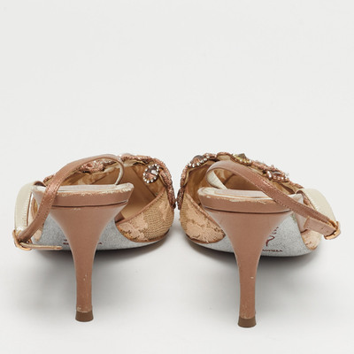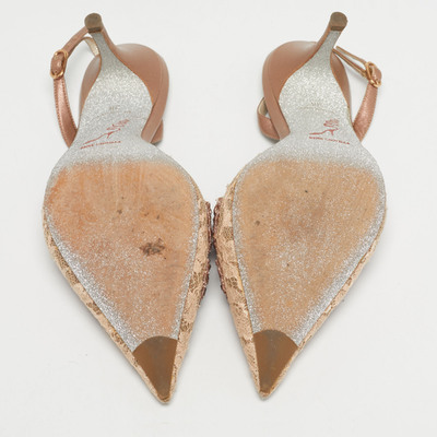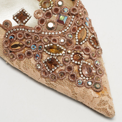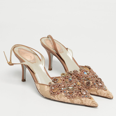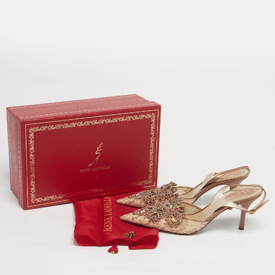 Golden lace and leather combine with crystals in René Caovilla’s Veneziana slingbacks. The intricate upper and slim heel show the brand’s signature craftsmanship. This level of detail positions them strongly in luxury searches for crystal embellished pumps.