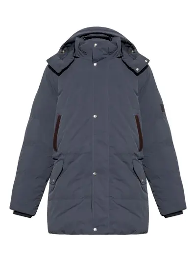 dark blue quilted design detachable hood zip and press-stud fastening side pockets