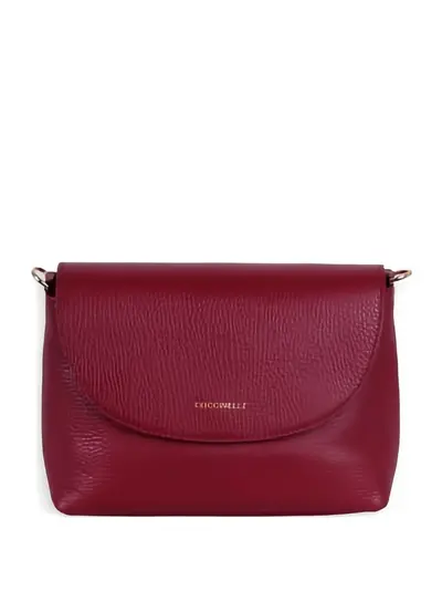red grained texture gold-tone logo lettering flap top adjustable shoulder strap