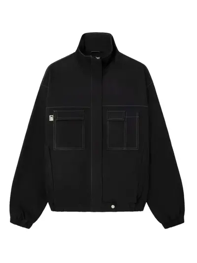 black concealed front zip closure two patch pockets on the chest high neck topstitching