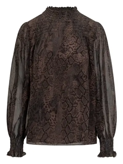 brown reptile print smocked detailing high neck long sleeves elasticated cuffs