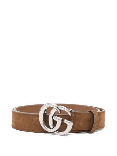 brown suede leather interlocking GG buckle silver-tone metal hardware single-prong buckle leather belt