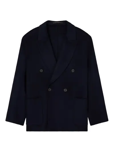 navy blue double-breasted button closure shawl lapel long sleeves front patch pockets buttoned cuffs