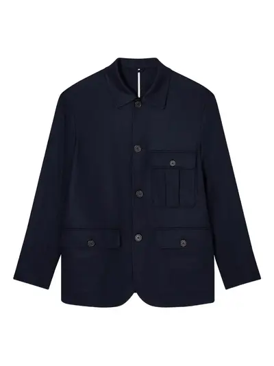 navy blue shirt collar front button closure three front patch pockets buttoned cuffs long sleeves