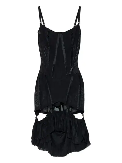 black suspender straps pleated ruffle trim mesh panels zip fastening garter straps