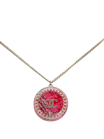 gold-plated metal body round resin pendant with CC logo details lobster clasp closure gold Serial Number: 14S This item has no inclusions. Condition: EXCELLENT. This previously owned item is in near-perfect condition with no signs of damage or use. Due to the exclusivity of this item and its limited availability, processing and delivery might take longer than usual. Please refer to the photos on this product page for a detailed view of the item, including any damages declared.
