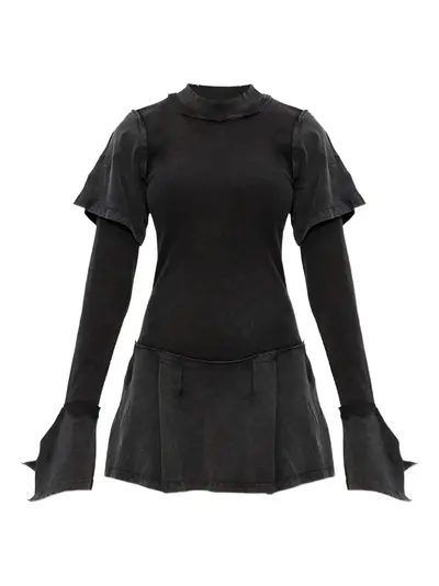 black ribbed texture flared sleeves pleated skirt mock neck split cuffs