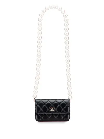 This clutch on chain features a quilted calfskin leather body, a faux pearl detailed strap, a front flap with magnetic snap closure, and interior zip and slip pockets. Black. Serial Number: 31679611. Inclusions: authenticity card. Condition: EXCELLENT. This previously owned item is in near-perfect condition with no signs of damage or use. Due to the exclusivity of this item and its limited availability, processing and delivery might take longer than usual. Please refer to the photos on this product page for a detailed view of the item, including any damages declared.