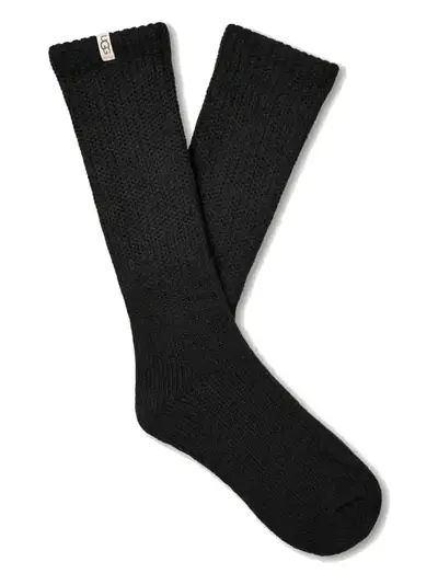 black ribbed knit logo tag Be sure before opening, as socks and hosiery can only be returned in their original, unopened packaging.