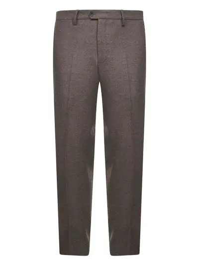 brown belt loops elasticated waistband side pockets rear buttoned welt-pockets front pressed creases