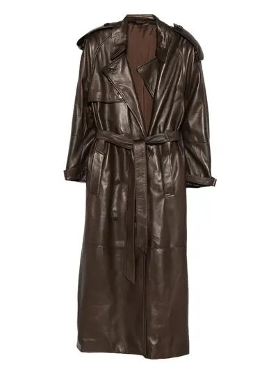 dark brown front button fastening adjustable waist belt side slit pockets long sleeves notched lapels