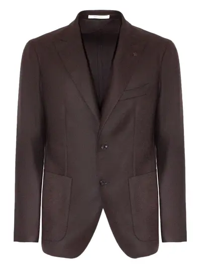 dark brown button fastening pin detail front flap pockets peak lapels buttoned cuffs