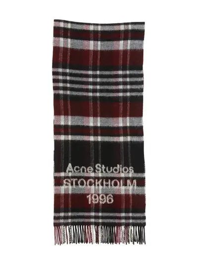 black, burgundy and white checked pattern fringed edges embroidered logo wool blend woven texture