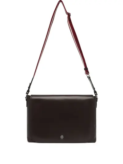 chocolate brown leather striped shoulder strap logo detail flap top silver-tone hardware