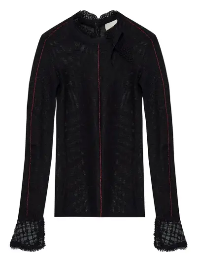 black lace trim long sleeves button fastening at the rear seam detailing high neck